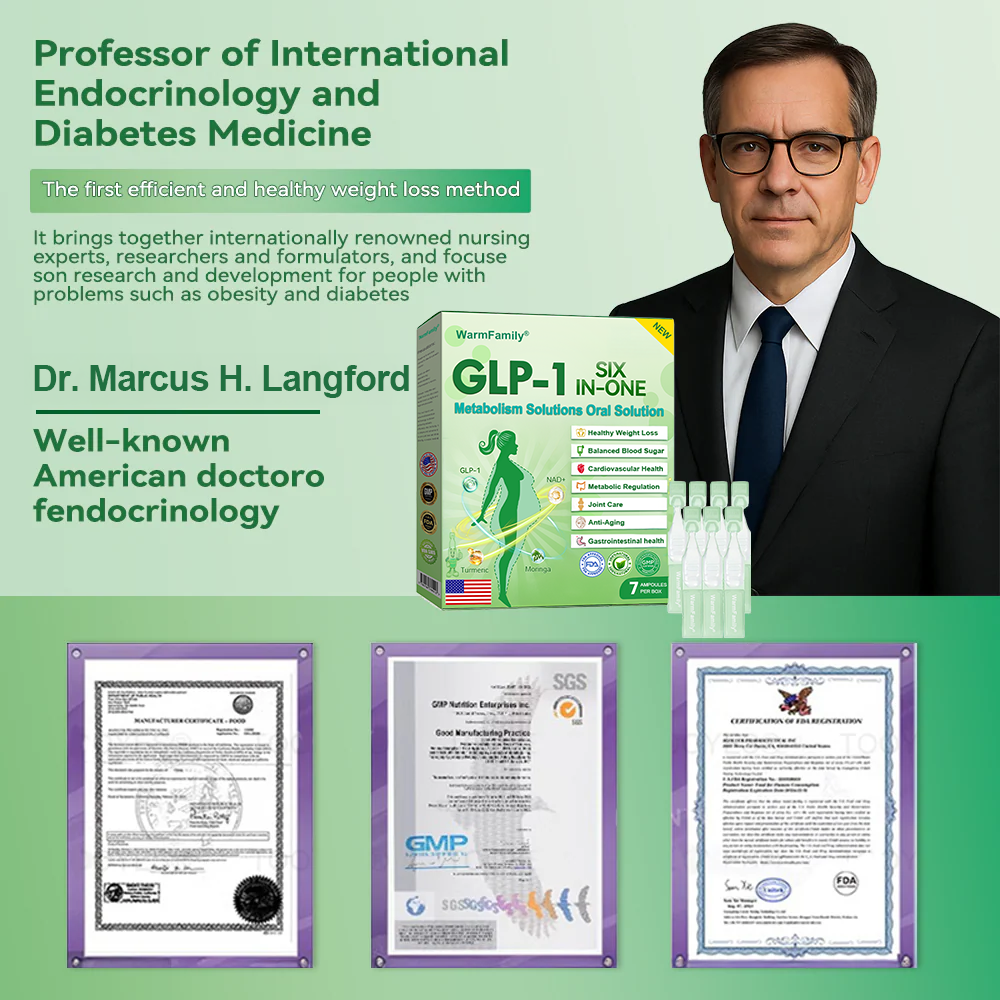 "As an endocrinologist, I am committed to finding effective and natural solutions for metabolic health and weight management. After extensive research and clinical trials with over 5,000 participants, I have found that WarmFamilyยฎ GLP-1 Six in One Health Solution Oral Liquid offers remarkable benefits for metabolism, appetite control, and overall well-being. This formula naturally supports GLP-1 activation, helping regulate blood sugar levels, curb cravings, and enhance fat burning. Its powerful blend of apple cider vinegar, turmeric, and other natural ingredients not only aids in healthy weight loss but also promotes digestive health, boosts immunity, and supports long-term metabolic balance. With the backing of modern medical research,ย WarmFamilyยฎ GLP-1 Six in One Health Solution Oral Liquidย is a trusted, science-driven choice for those seeking a natural and effective approach to weight management and overall health."